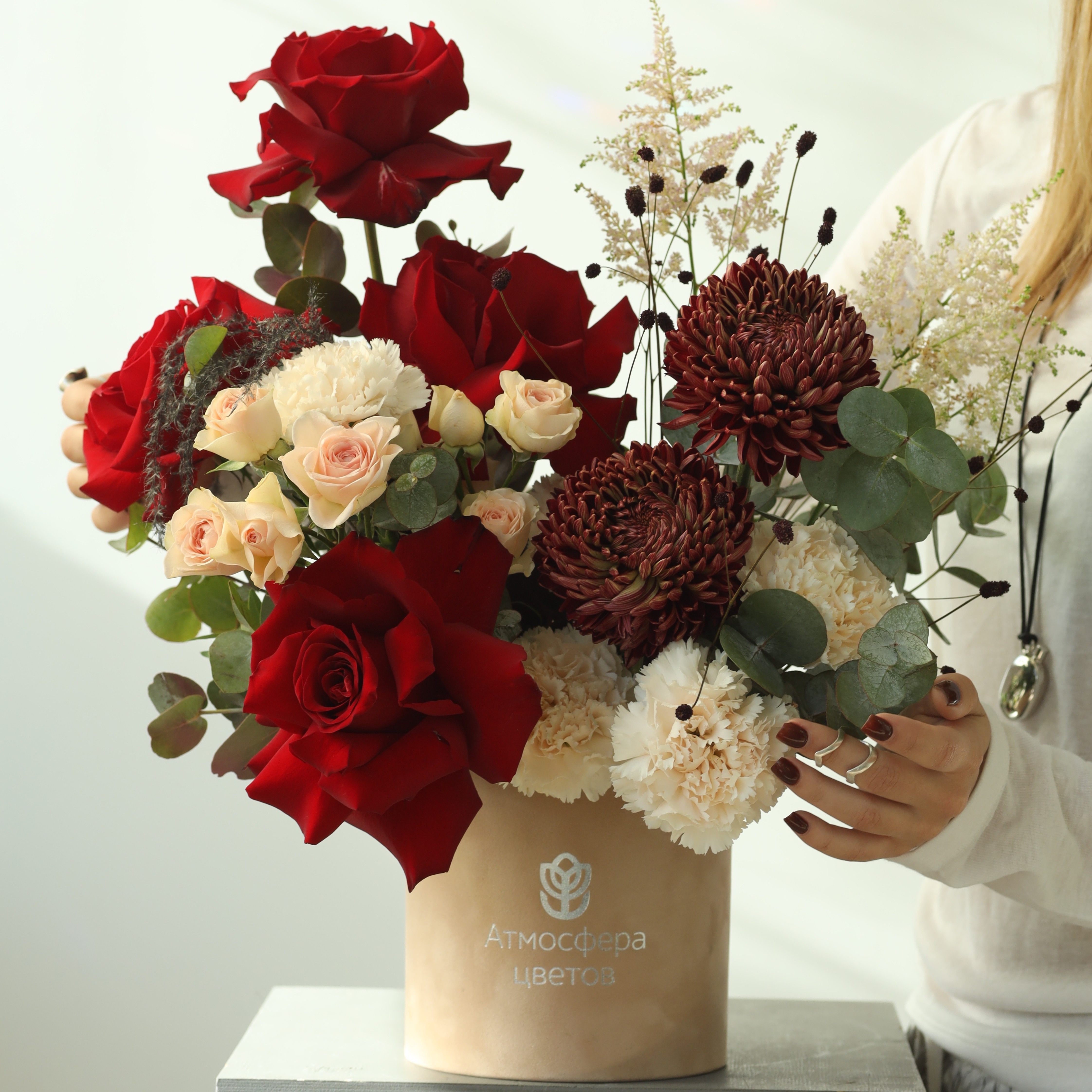 Состав композиции: Коробка шл бархат S (d14) 1, Оазис (1), Хризантема одноголовая Бигуди (2), Роза кустовая (2), ВАУ-Роза Эквадор (4), Гвоздика сортовая (5), Астильба (2), Кровохлебка (1), Эвкалипт пучок (0,25), Мискантус (1)