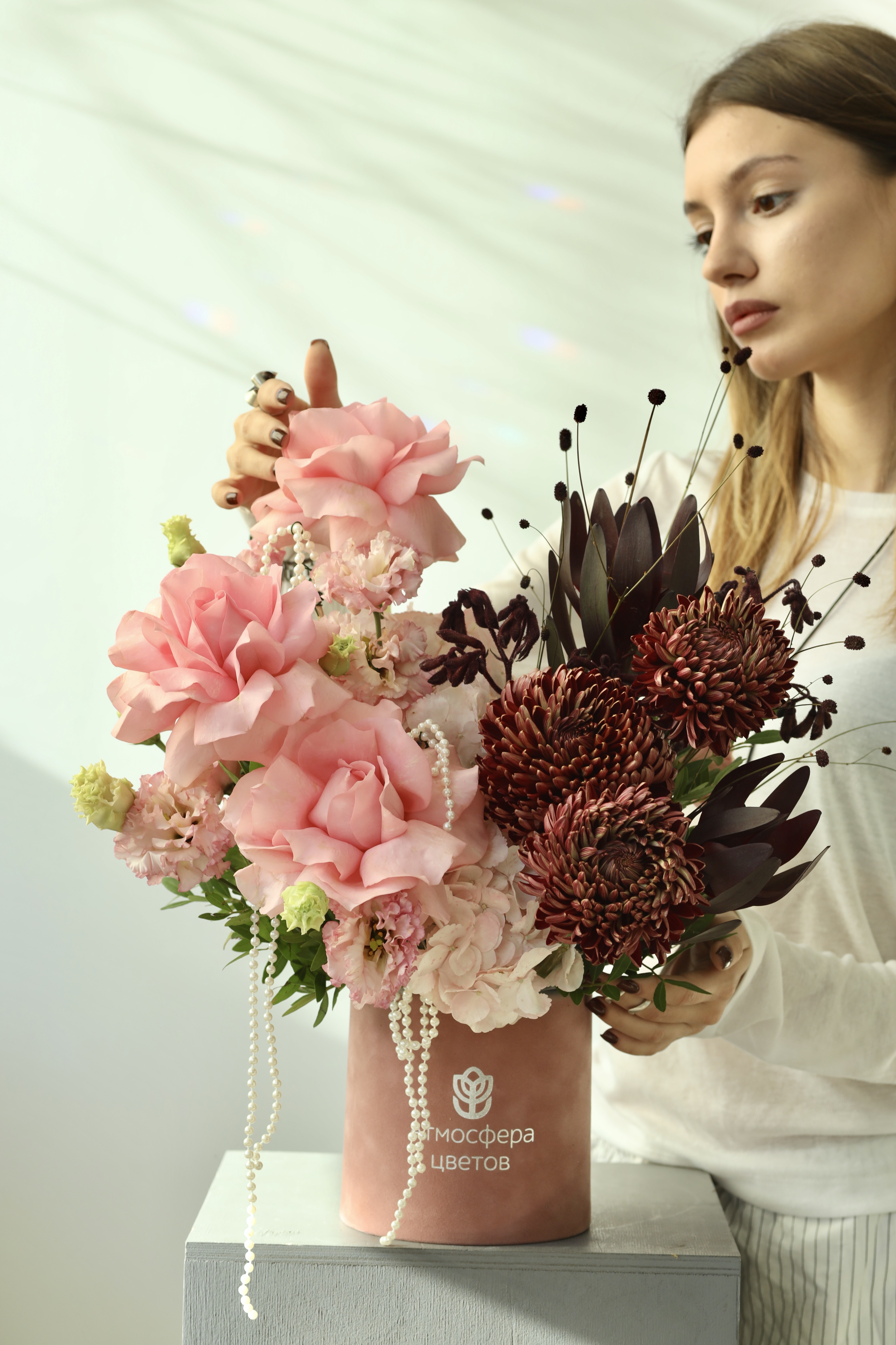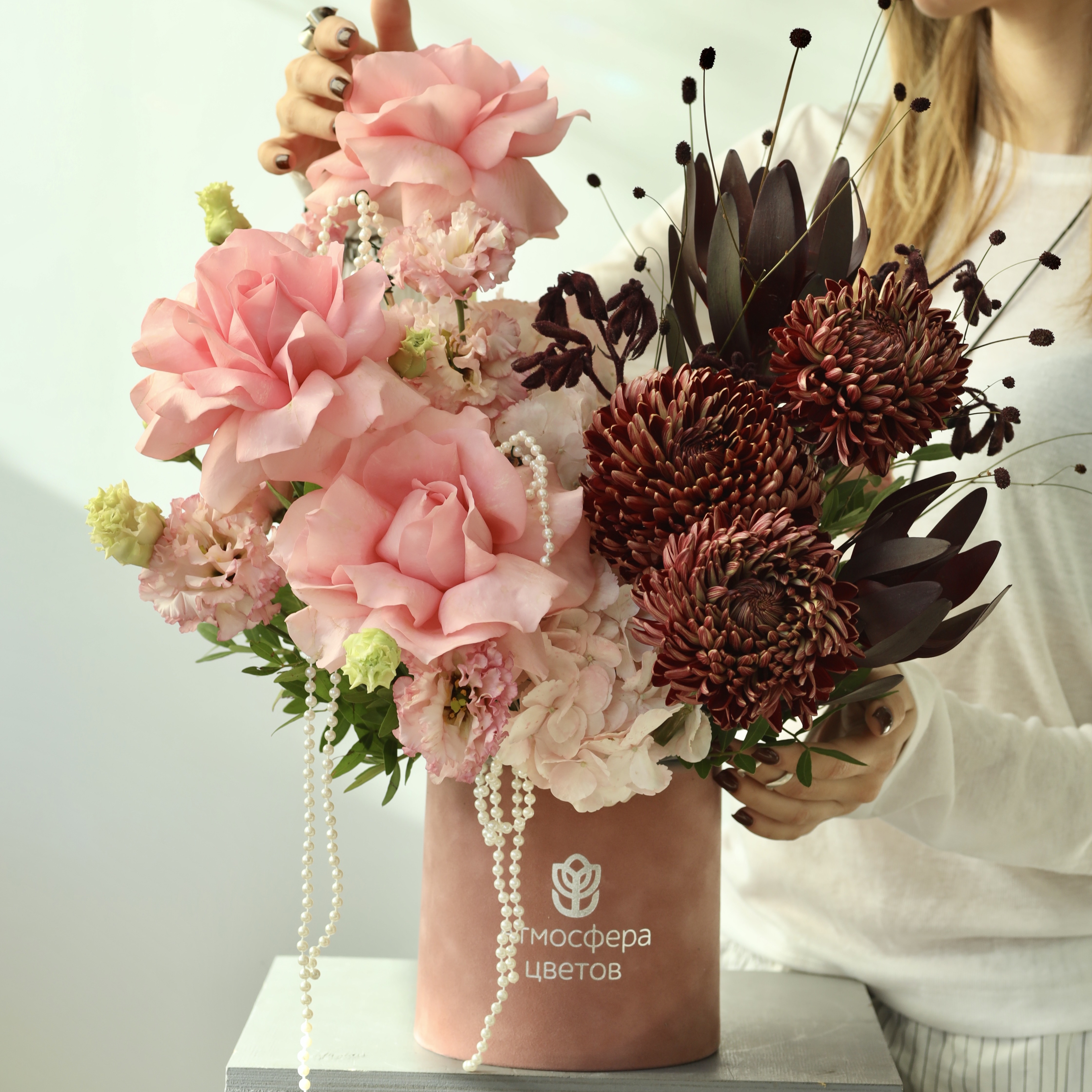 Состав композиции: Коробка шл бархат S (d14) 1, Оазис (1), Гортензия (1), ВАУ-Роза Эквадор (3), Хризантема одноголовая Бигуди (3), Леукадендрон (2), Кровохлебка (1), Агапантус (2), Эустома (2), Лента бусы декоративные (1)